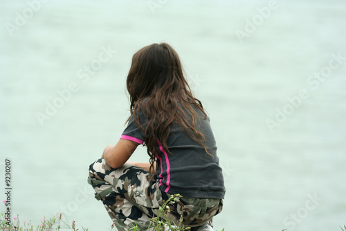 "Jeune fille seule de dos au bord de la mer" photo libre de coloriage fille seule au parc